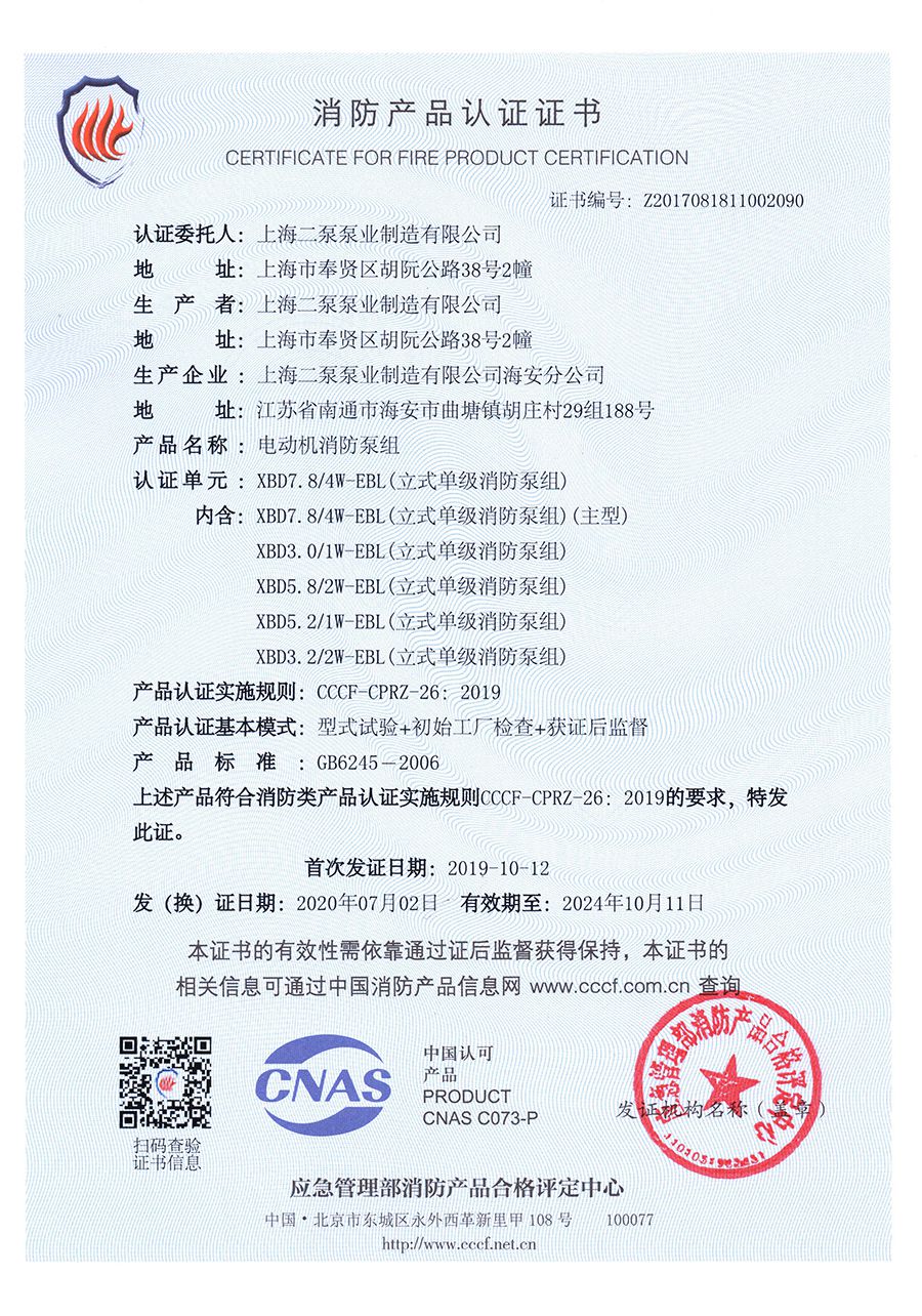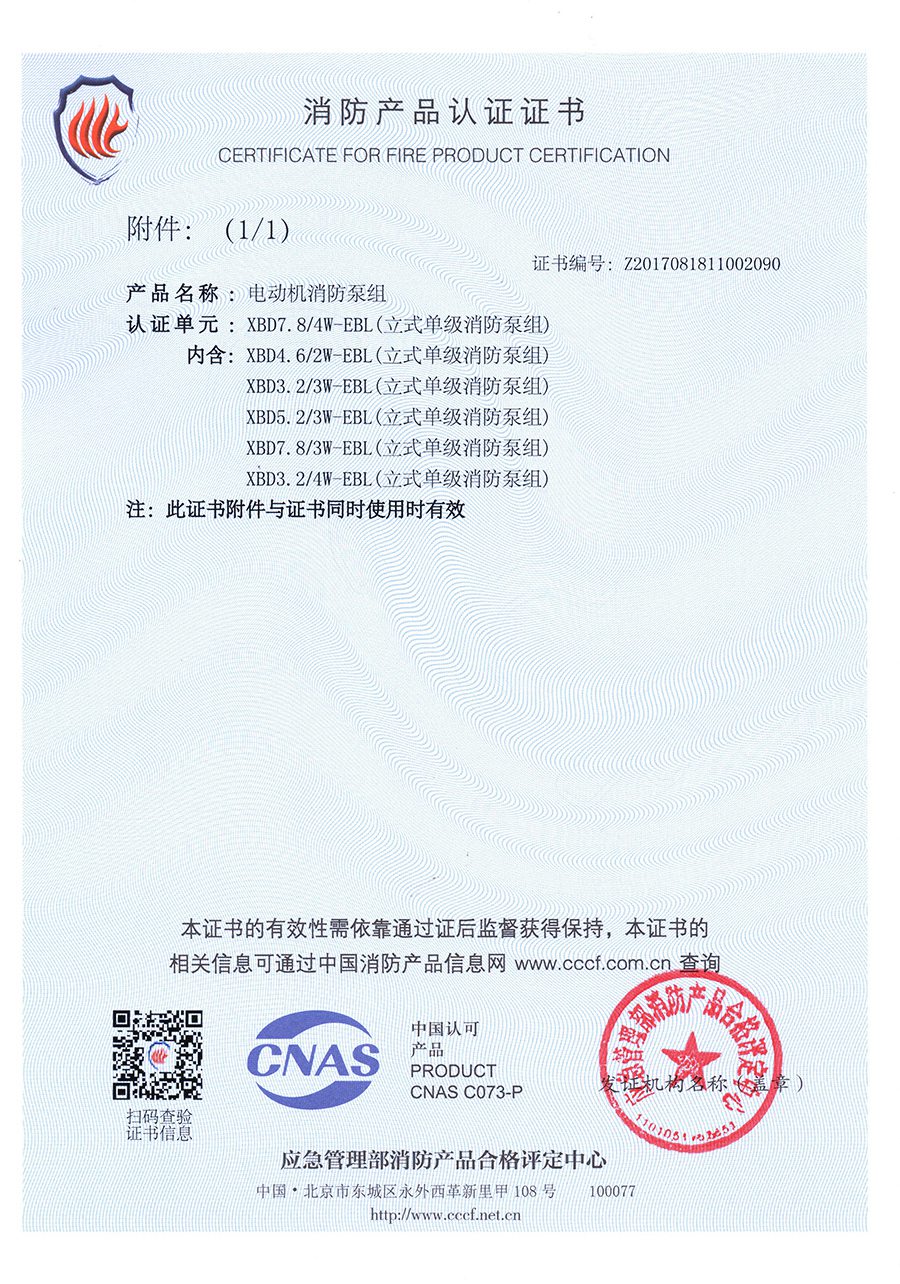 穩(wěn)壓立式單級(jí)EBL-消防產(chǎn)品認(rèn)證證書