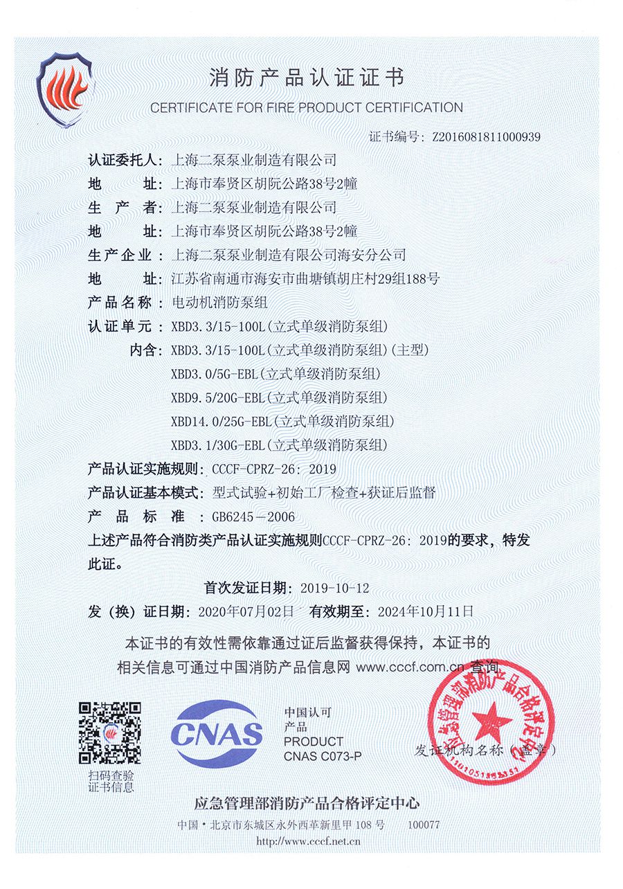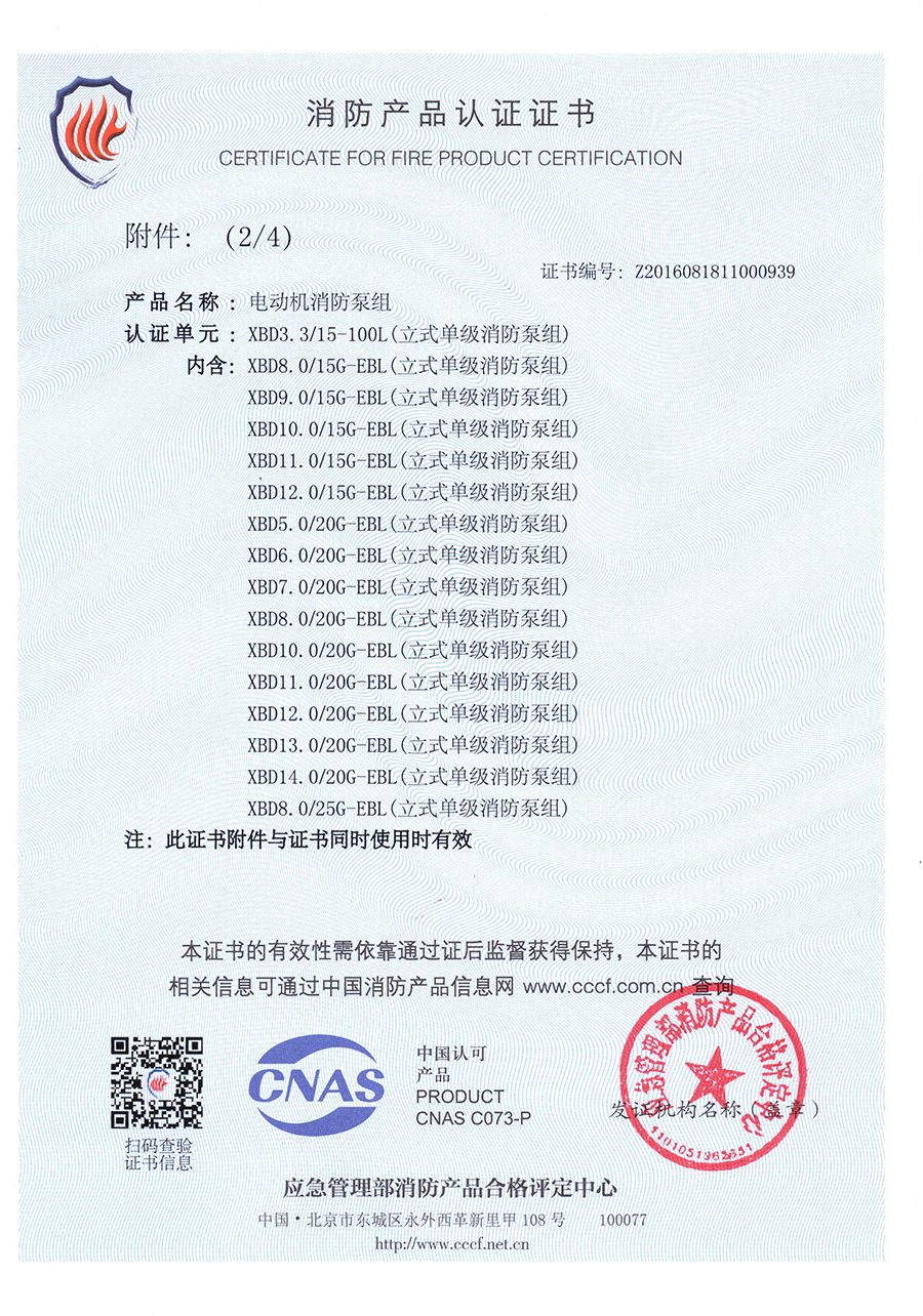 立式單級(jí)EBL-消防產(chǎn)品認(rèn)證證書(shū)